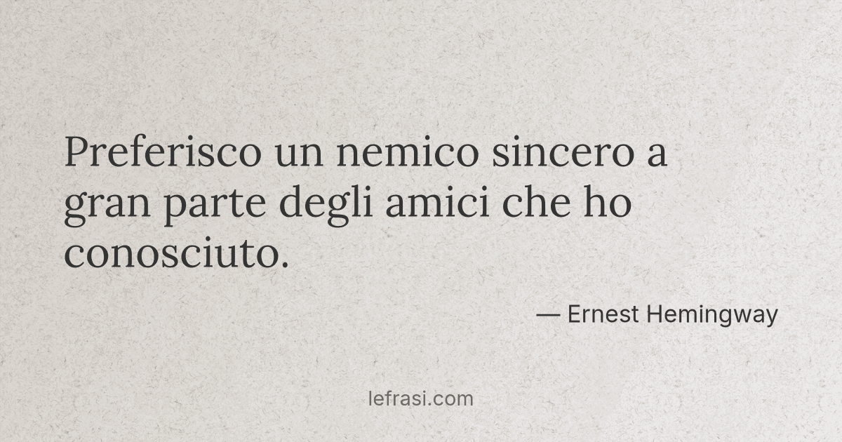 La citazione esprime una profonda riflessione sull'importanza della sincerità e della lealtà nelle relazioni umane. Hemingway suggerisce che un nemico apertamente ostile è preferibile a un amico che nasconde le proprie intenzioni o agisce in modo ambiguo. Questo non significa che la sincerità debba essere sempre associata a conflitti, ma che una relazione autentica richiede la capacità di affrontare la verità, anche se essa è dolorosa. La sincerità, in questo contesto, diventa un valore fondamentale per costruire legami significativi, poiché permette di evitare il rischio di essere ingannati o di vivere in un'illusione. La citazione invita a cercare relazioni basate su una base di fiducia reciproca, dove la verità non è un ostacolo ma un elemento essenziale per la crescita personale e per la comprensione autentica degli altri.