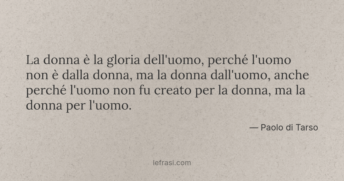 La donna è la gloria dell'uomo, perché l'uomo non è dalla donna, ma la donna dall'uomo, anche perché l'uomo non fu creato per la donna, ma la donna per l'uomo.